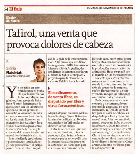 El diario Clarín reflejó en la sección El País del domingo 4 de noviembre de 2012 la frustrada venta de la línea Tafirol hacia el laboratorio Elea.