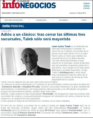 El diario InfoNegocios de Córdoba, dirigido por Íñigo Biain, publicó en su edición del jueves 11 de abril de 2013 un artículo sobre el cierre de la cadena de farmacias Taleb.