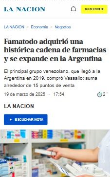 El miércoles 19 de marzo de 2025, el diario La Nación publicó un artículo sobre la adquisición de la cadena de farmacias Vassallo por parte de la venezolana Farmatodo consolidando su expansión en territorio nacional. Ver artículo