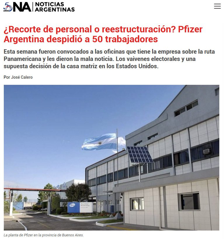 El sábado 2 de diciembre de 2023, la agencia Noticias Argentinas publicó que el laboratorio norteamericano Pfizer implementó despidos en la Argentina.