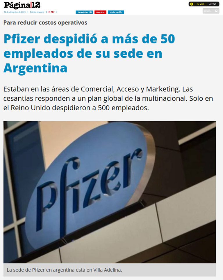 El sábado 2 de diciembre de 2023, el diario Página 12 informó que Pfizer despidió a más de 50 empleados de su sede en Argentina.