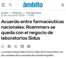 El miércoles 8 de octubre de 2025, Ámbito Financiero publicó el artículo «Acuerdo entre farmacéuticas nacionales: Roemmers se queda con el negocio de laboratorios Sidus».