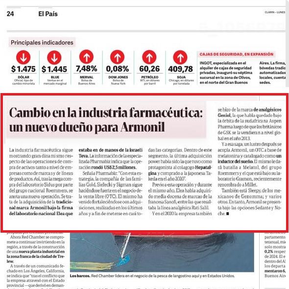 El viernes 25 de octubre de 2024, el diario El Cronista publicó el artículo «Otra Multinacional se va de la Argentina: una farmacéutica mexicana vende sus operaciones«. Ver artículo