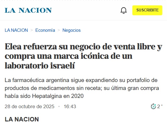 El martes 28 de octubre de 2025, el diario La Nación detalló que Elea compra una marca icónica de un laboratorio israelí. Ver artículo