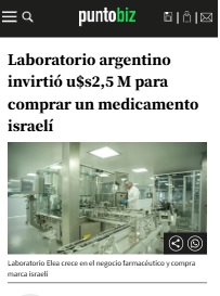 El martes 28 de octubre de 2025, el diario PuntoBiz detalló que un laboratorio argentino invirtió u$s 2.5 M para comprar un medicamento israelí. Ver artículo