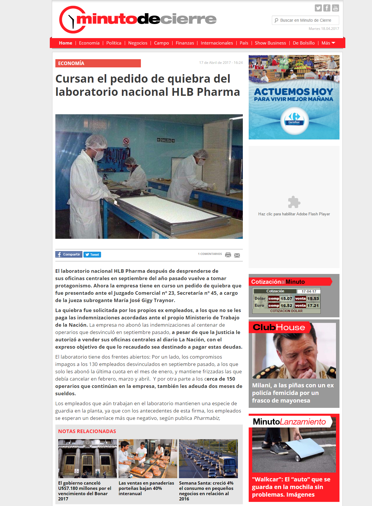 El portal de noticias Minuto de Cierre, creado por el periodista Lucio Di Matteo, citó el día de ayer, lunes 17 de abril, a Pharmabiz en su artículo “Cursan el pedido de quiebra del laboratorio nacional HLB Pharma”. Ver artículo