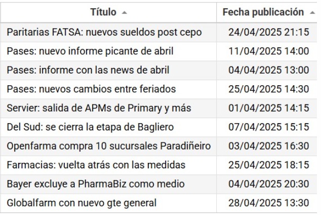 Casi al cierre de este top 10, una nota sobre la alemana Bayer quedó novena. La multi llevó a cabo su clásico Pharma Media Day, y una vez más excluyó a Pharmabiz como medio especializado. Esta vez la cita fue en Alemania y como ya es habitual su head de «Incomunicación», Virginia Gilligan, ha vuelto a soslayar a este medio. El público le dio click al artículo a fin de conocer los pormenores de este actuar de la compañía. El gran dato es que es el único artículo del top ten que no se disparó por newsletter. Así esto refleja con mayor claridad el interés de los lectores. Ver artículo Bayer excluye