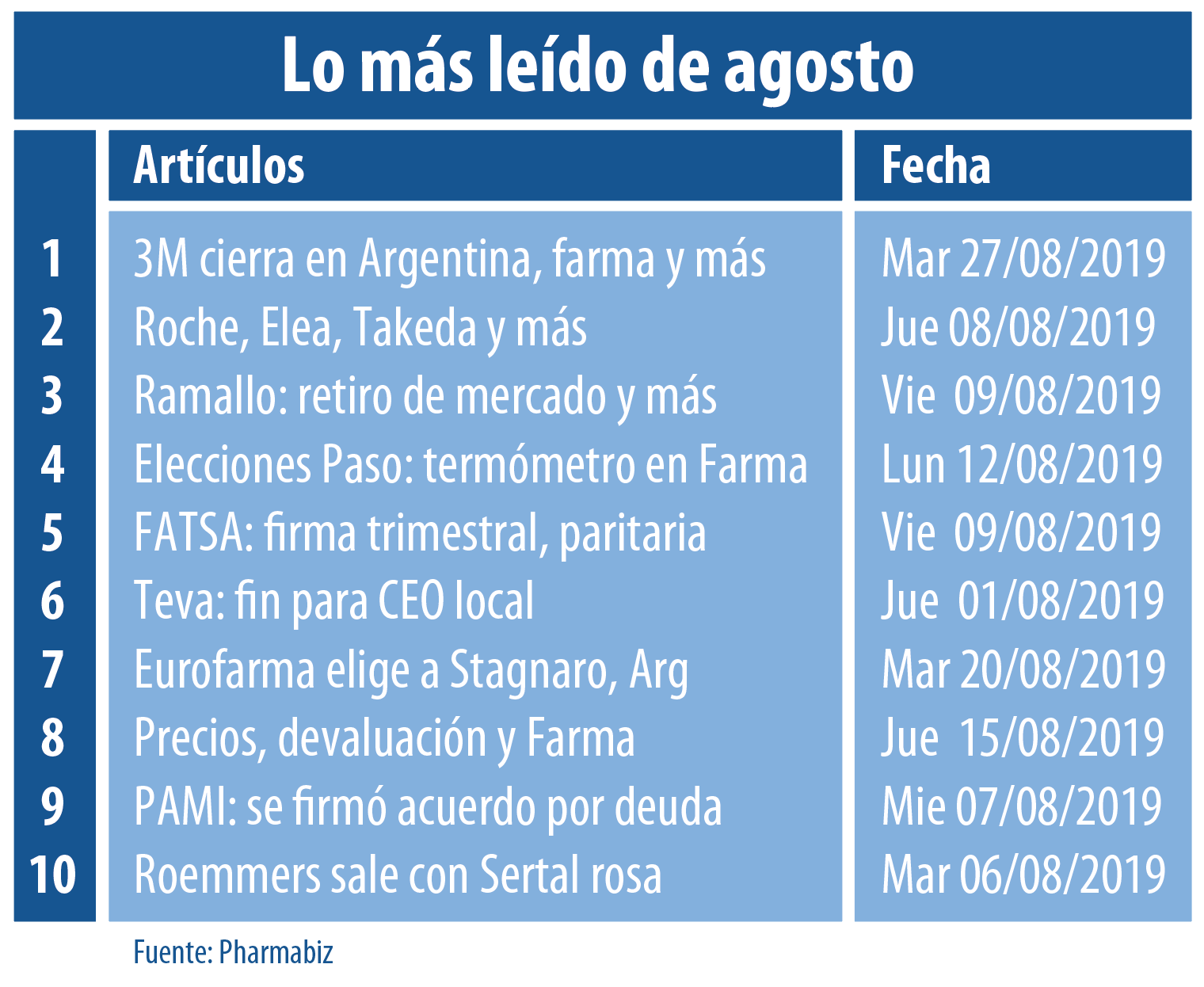 En el lugar número seis de lo más leído de agosto se ubicó «Teva: fin para CEO local». Allí se brindaron detalles sobre del fin de ciclo para el argentino Nicolás Lodola, al frente de la filial local de la israelí Teva. Ver artículo.