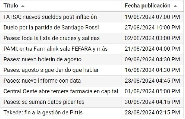 Séptimo figuró, una vez más, un informe de pases, en el que se enumeraron los fines de ciclo, cruces, renuncias y más. En la nota del viernes 23 de agosto Pharmabiz pasó revista a todo el espectro del mercado y los usuarios le dieron click a este artículo que desgranó las principales novedades. Ver artículo Pases: nuevo informe con data