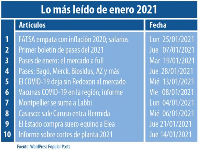 El mes de enero comenzó con novedades relativas a los pases de la industria. Fueron varios los artículos que llegaron al top 10 del mes relacionados con egresos y cruces. Pharmabiz relevó cuáles fueron los temas más leídos y que generaron más clicks.