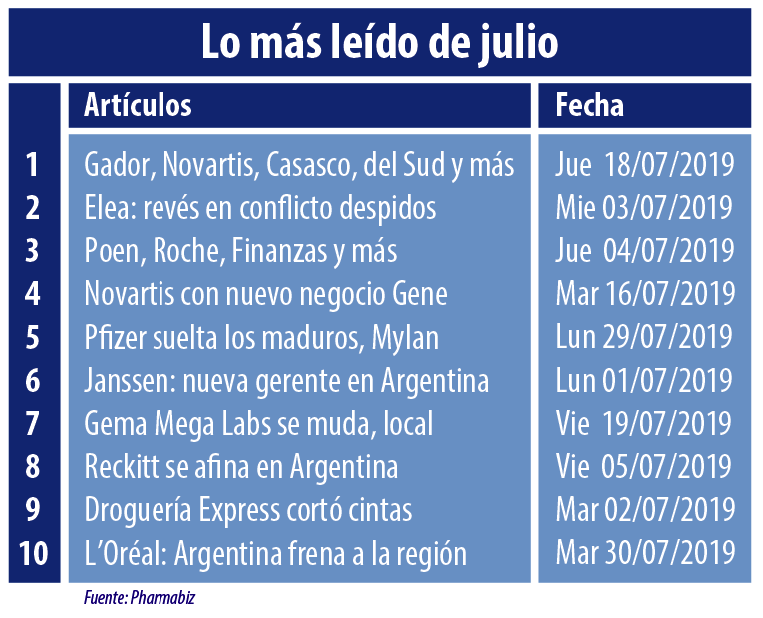 En paralelo, al tercer escalón de lo más leído de julio entró otra edición de pases publicada los primeros días del mes. El artículo titulado «Poen, Roche, Finanzas y más» dio cuenta de la alta rotación en las áreas financieras de los laboratorios y del desgrane que está sufriendo la suiza Roche. Ver artículo