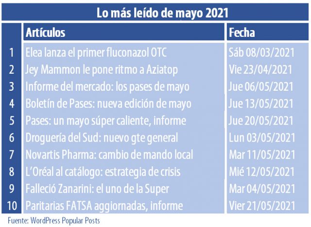 En el quinto mes del año el primer lugar fue para un artículo sobre el primer fluconazol OTC que se lanzó al mercado de la mano del laboratorio Elea. Si bien el producto bautizado EvaCare Gyno se presentó en marzo con un spot publicitario, esta novedad de la empresa propiedad de las familas Sigman, Sielecki y Gold encabezó lo más leído durante mayo. Ver artículo Elea.
