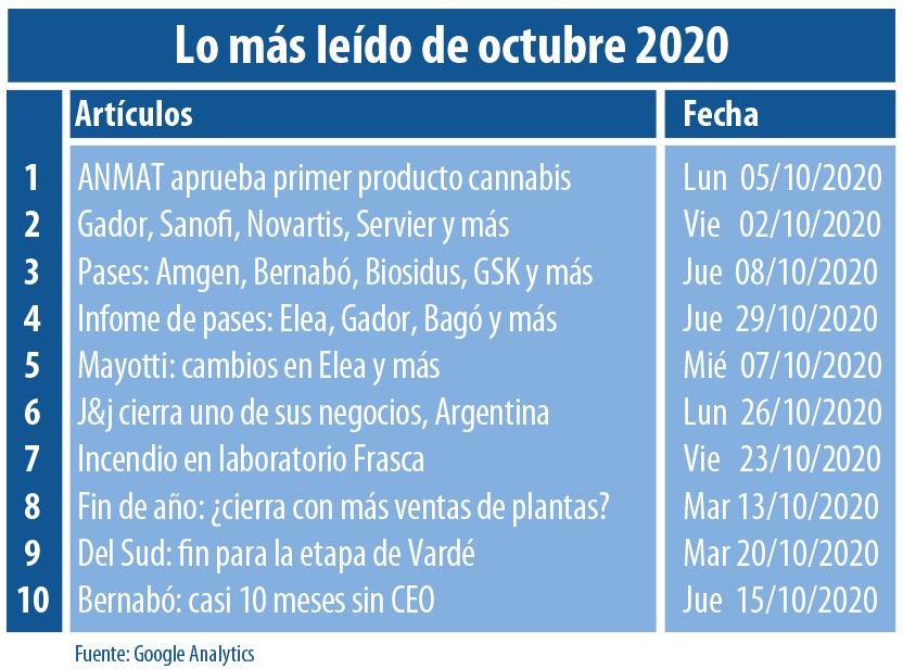 En el décimo mes del año los pases y movimientos entre empresas fueron la nota relevante y lo que más movió los clicks en Pharmabiz. Seis de las diez notas que conformaron el top ten respondieron a cambios en la grilla de los laboratorios.