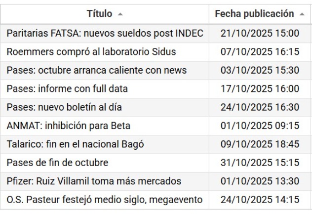 Luego, el top 5 se encuentra dominado por noticias vinculadas a los pases del sector, ya que arrancó el último tramo del año y en los laboratorios se aceleran los movimientos. El público de Pharmabiz siempre está super atento a cada uno de estos detalles. En el tercer lugar quedó el boletín publicado el viernes 3, mientras que cuarto se asentó el informe full con toda la data del viernes 17. Y quinto se ubicó el reporte del viernes 24. Ver octubre arranca caliente // Ver Pases: informe full // Ver Pases: nuevo boletín
