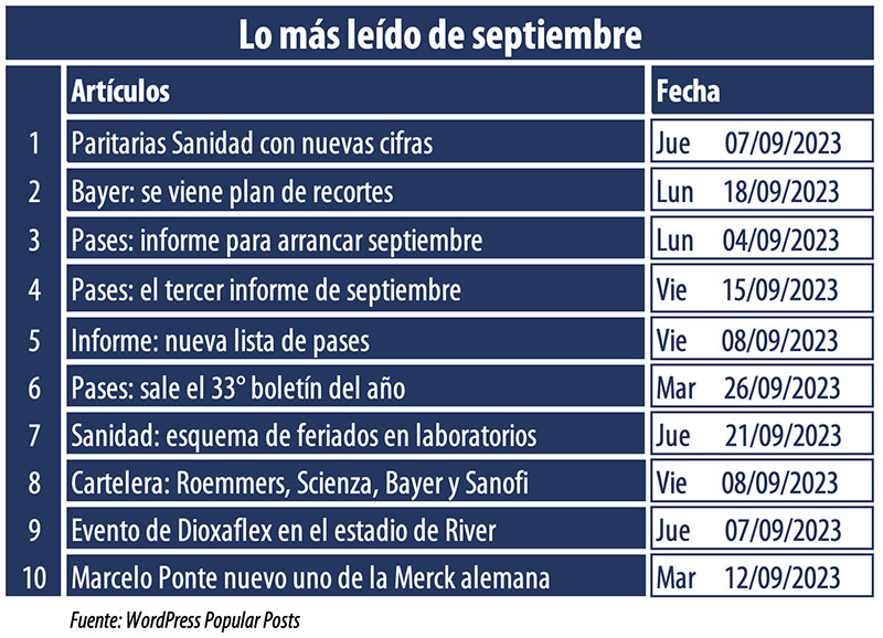 Y en esta parte del top 10 vuelve a figurar un boletín de pases entre lo más leído del mes. Se trata del artículo publicado el martes 26 de septiembre. Es que de cara al comienzo de octubre se anotaron varios arranques de ciclo en la industria de farma local, y los usuarios especializados quisieron estar a tono con las noticias del sector. Ver artículo Pases: sale el 33° boletín del año