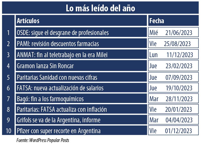 Asimismo, la inflación recalentó las negociaciones salariales, y los artículos vinculados a las paritarias resaltan en este ranking. A la quinta posición llegó el informe publicado en septiembre, que desgranó las nuevas cifras salariales para Sanidad tras la devaluación de agosto. El gremio de la industria, FATSA, selló acuerdos de actualización salarial retroactivos al octavo mes con seis convenios del sector asistencia, correspondiente a la paritaria 2023. Ver Paritarias Sanidad
