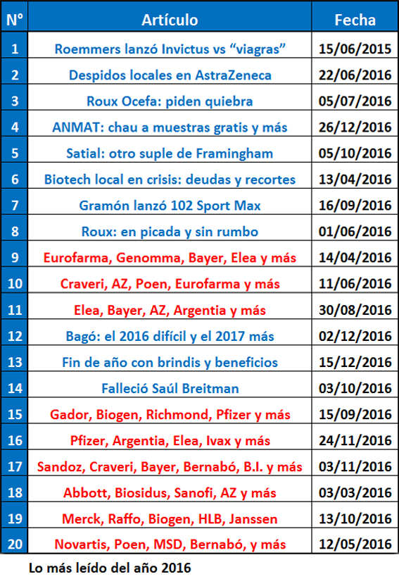 La nota publicada casi al cierre del año y que tuvo como protagonista al laboratorio nacional Bagó se ubicó en el puesto número 12 de este ranking anual. Este posicionamiento no es menor, ya que el artículo se publicó cuando a diciembre le quedaban los días contados.