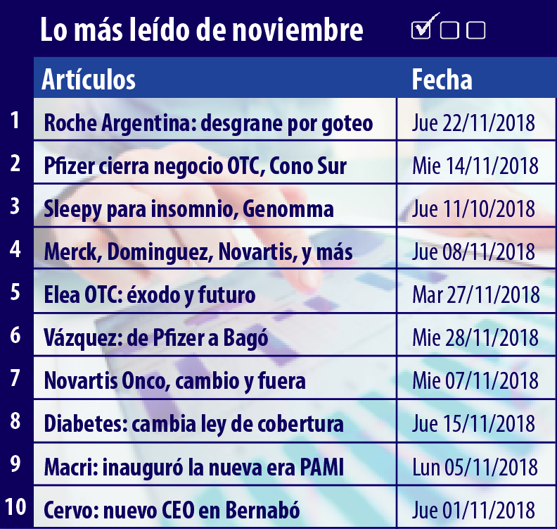 Dos artículos que reflejaron bajas y cierres estuvieron en la cima de lo más leído del mes de noviembre. Lo que más interesó a los lectores fue el desgrane de mandos medios que se está produciendo en Roche Argentina y el cierre de la unidad de OTC en Pfizer Argentina y Chile.