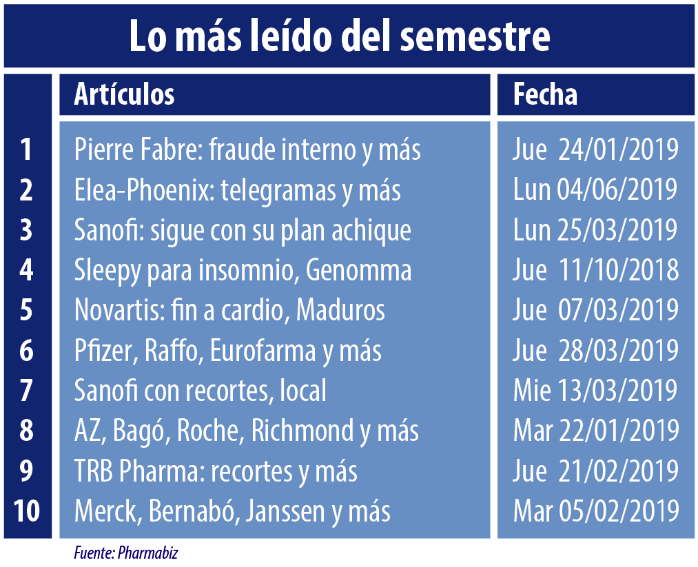 Queda a la vista que los conflictos laborales y las desvinculaciones en el sector de Farma acapararon la mayor atención por parte de los lectores. Cinco de los diez artículos que conforman el ranking refieren a reestructuraciones y planes de achiques encarados en el país por laboratorios como el nacional Elea-Phoenix, la francesa Sanofi, la suiza Novartis y la firma TRB Pharma.