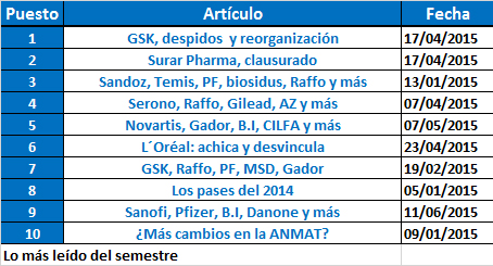 Los puestos número tres y cuatro de los artículos más leídos del semestre fueron ganados por artículos que anunciaron pases y nombramientos de ejecutivos. Resaltó la designación de David Martin al frente de la planta de materias primas que Pierre Fabre tiene en la Argentina. Martin llegó desde Francia para reemplazar a Francois Macarez. Ver artículo tres.