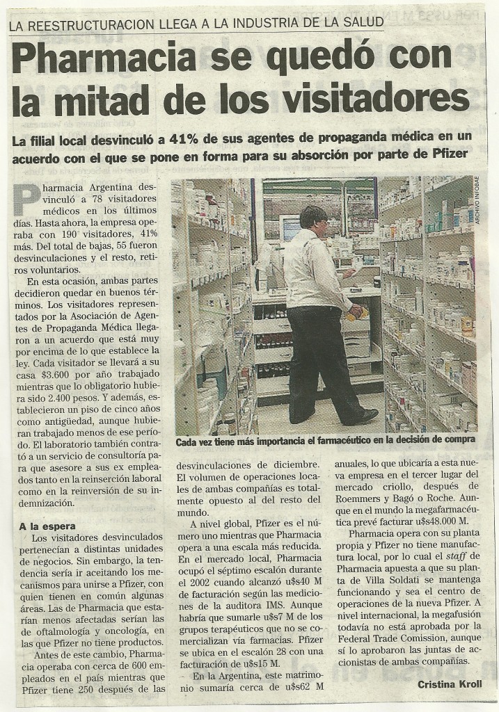 Pharmacia Argentina desvinculó a 78 visitadores médicos en los últimos días. Hasta ahora, la empresa operaba con 190 visitadores, 41% más. Del total de bajas, 55 fueron desvinculaciones y el resto, retiros voluntarios.
