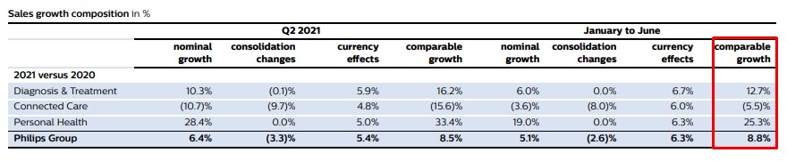 En este primer semestre del 2021 la neerlandesa Philips ascendió un 9% en ventas a nivel global. Y esto está alineado con su estrategia de centrarse en el negocio de Healthcare. Ver reporte.