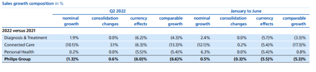 La base de comparación no favoreció a la performance de Philips en esta primera mitad del 2022. Es que en el primer semestre del 2021 la neerlandesa ascendió un 9% en ventas a nivel global. En contrapartida, este año se derrumbó un -5%. Ver reporte.