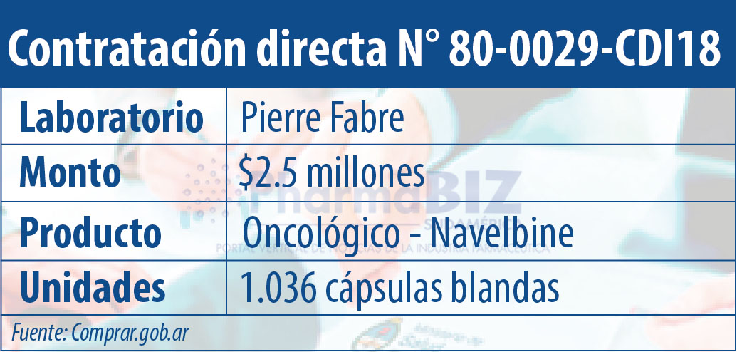 La ganadora resultó ser la droguería Dimec, que participa en nombre de la francesa Pierre Fabre. La compañía le entregará al Ministerio de Salud de la Nación 1.036 cápsulas blandas de su producto indicado para cáncer de mama Navelbine Oral a cambio de $2.5 millones (u$s 106 mil).