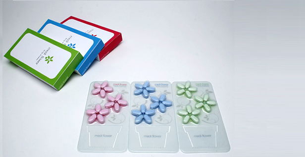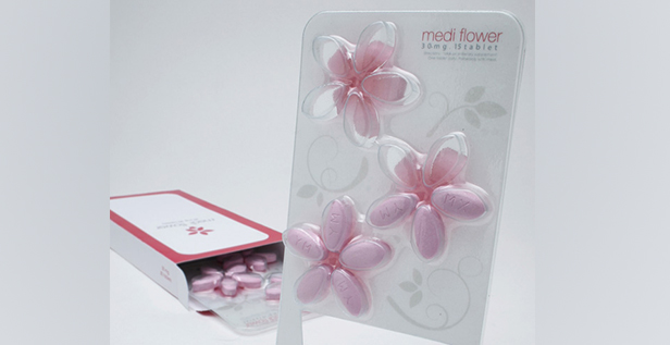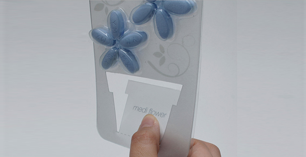 Se trata de Medi Flower un original paquete con forma de flores en el que cada pétalo es una pastilla. El packaging cuenta además con una maceta calada que sirve para apoyar el blíster en el escritorio, la mesita de luz, el estante del baño, etc.