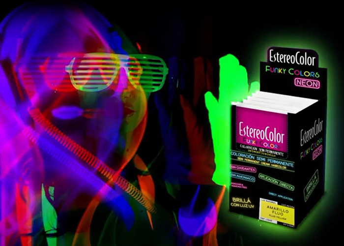 Se trata de FunkyColors, una coloración flúo semi-permanente de aplicación directa, sin amoníaco, que se ilumina cuando el cabello está debajo de lámparas UV o luz negra.