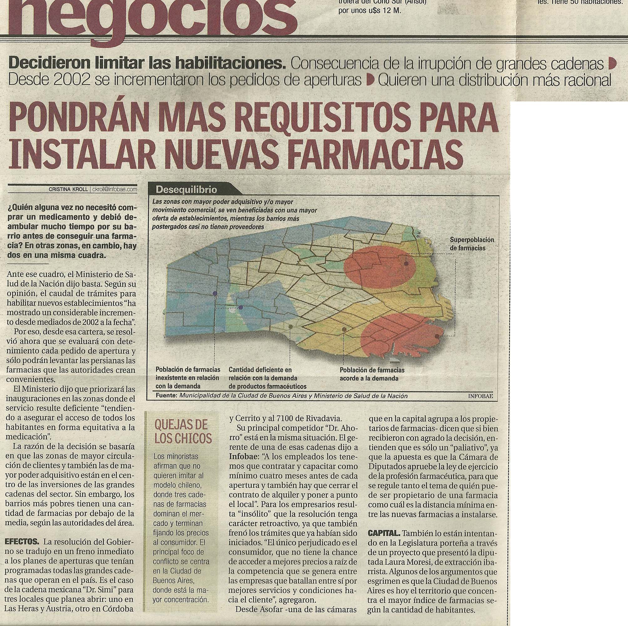 Decidieron limitar las habilitaciones. Consecuencia de la irrupción de grandes cadenas. Desde 2002 se incrementaron los pedidos de aperturas. Quieren una distribución más racional. Pondrán más requisitos para instalar nuevas farmacias. ¿Quién alguna vez no necesitó comprar un medicamento y debió deambular mucho tiempo por su barrio antes de conseguir una farmacia? En otras zonas, en cambio, hay dos en una misma cuadra.