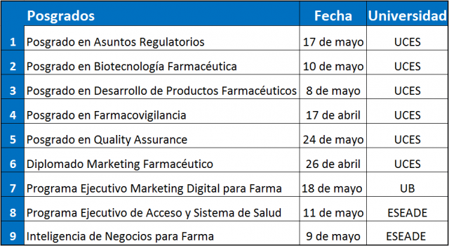En el mes de mayo, la misma universidad abrirá sus puertas para el posgrado en Desarrollo de Productos Farmacéuticos, que comienza el día lunes 8, en la sede de Corrientes 844, en Olivos. También, el miércoles 10 de mayo, dará inicio al posgrado en Biotecnología Farmacéutica, con el objetivo de aportar conocimientos actualizados y específicos sobre este nicho de oportunidades para el sector industrial farmacéutico.