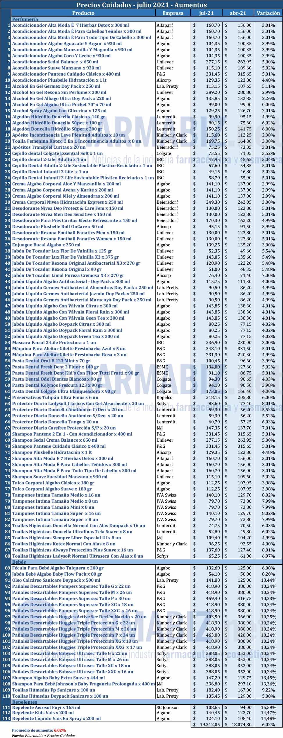 El programa de Precios Cuidados se renovó el miércoles 7 de julio, en un contexto en el que la inflación ya acumula un 21.5% desde enero a mayo de este 2021. Y en sintonía con este guarismo, esta nueva edición exhibió aumentos en promedio del 5%, según se comunicó desde el Ministerio de Desarrollo Productivo. Ver Comunicado