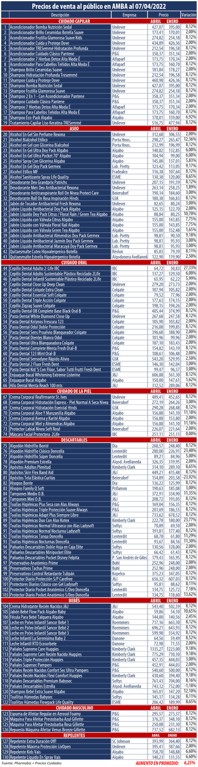 La categoría de cuidado capilar es una de las que mayor competencia presenta. En enero, el listado contabilizaba 51 tratamientos. Sin embargo, en este segundo trimestre del 2022 las opciones se achicaron y la nómina pasó a estar conformada por 46 referencias: 23 champúes; 18 acondicionadores; tres tinturas; una crema capilar; y un fijador para el cabello. Allí resalta la gigante Unilever, con sus marcas Sedal; Dove; Suave; Tressemé; y Lord Cheseline. También figuran la norteamericana P&G con Pantene; la latina Alicorp -cuya operación en la Argentina quedó recientemente en manos de capitales nacionales-, con Plusbelle; la francesa L’Oréal, con Elvive; la italiana Alfaparf, con Alta Moda É -posicionada fuertemente en peluquerías-; la nacional Algabo, con su alternativa homónima; y el local ESME, con Life Quality. Las distintas presentaciones, de acuerdo a lo contrastado por Pharmabiz, registraron aumentos de precios entre un 2% y un 8,12%.