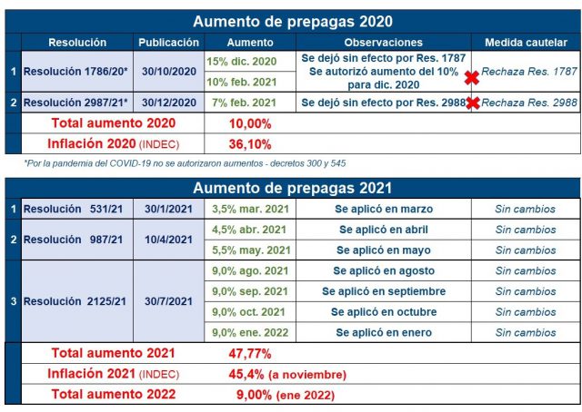 Tras un 2020 en el que las prepagas se vieron vedadas de aumentar sus cuotas, en julio del 2021 el Ministerio de Salud resolvió, a través de la resolución n° 2125, que se apliquen subas escalonadas, del 9% cada una, desde agosto hasta este enero. Ver artículo Prepagas: luz verde para aumentos.