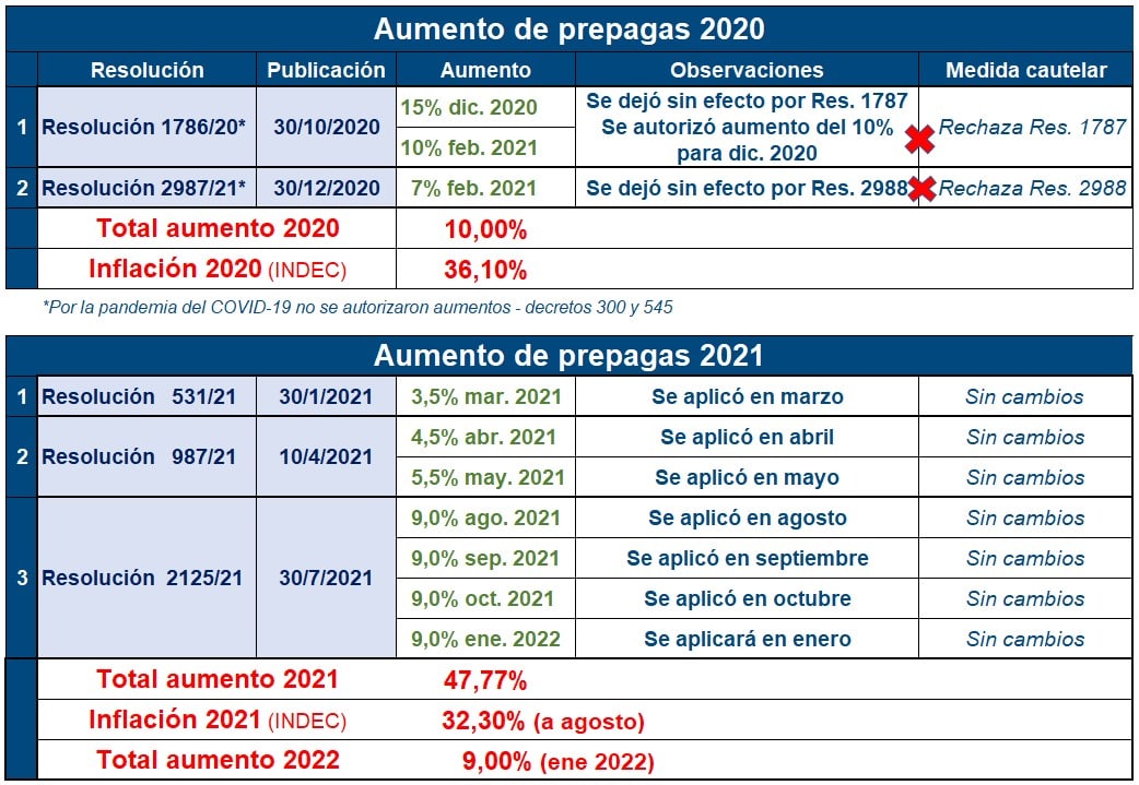 A fines de julio, el Ministerio de Salud resolvió, a través de la resolución n° 2125, que se apliquen tres subas de agosto a octubre, del 9% cada una. Así, se llegaría a un aumento total de 47,77% en 2021. Ver artículo Prepagas: luz verde para aumentos.