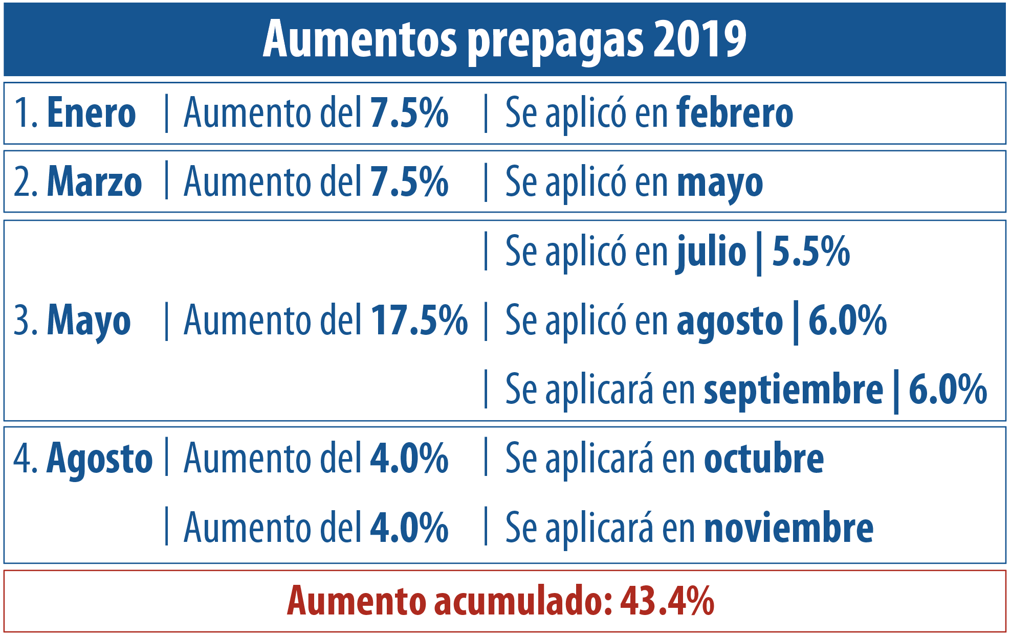 La misma sale a complementar a los últimos aumentos aprobados en mayo e implicará dos retoques del 4% cada uno, los que se activarán a partir del 1º de octubre y desde el 1º de noviembre. Combinados con los ya autorizados en enero, marzo y mayo, suman un total del 43.4%, cifra que supera a la inflación del 40% proyectada por el Banco Central para el 2019. Ver resolución 1701