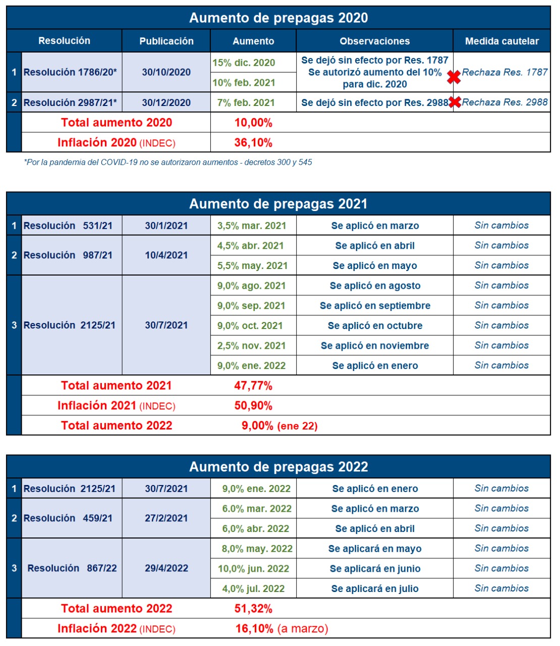Después de un 2020 en los que los aumentos estuvieron limitados, las prepagas vuelven a aplicar incrementos en este 2022. Y el ritmo es mayor incluso al del 2021, cuando hasta mayo se habían retocado las cuotas un 13,85% en total. Ver artículo Prepagas: mayo arranca con aumento.