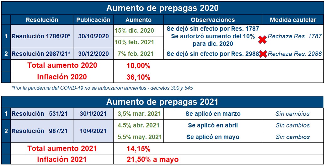 La segunda remite a la resolución 2987/20 del 30 de diciembre, que autorizaba una mejora del 7% a partir de febrero de 2020. La medida fue dejada sin efecto por la 2988/20, al día siguiente de ser comunicada, mediante un suplemento del Boletín Oficial en el último día del año. Ver artículo Prepagas estrenan 2021 con suba.