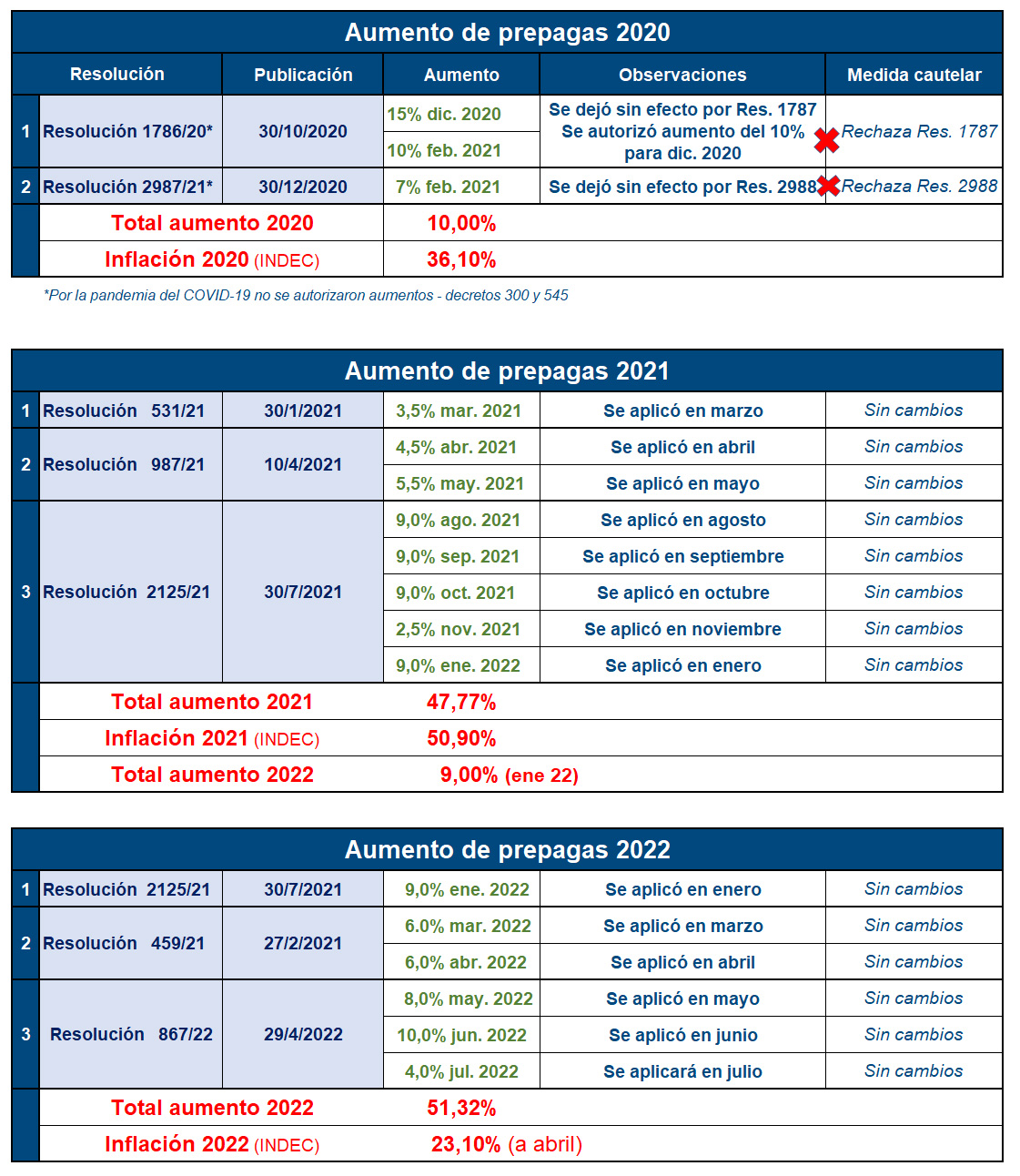 Estas actualizaciones fueron autorizadas en abril por el Ministerio de Salud, a través de la resolución 867. Además, se estipuló una tercera suba en julio, del 4%. Ver resolución 867 // Ver artículo Prepagas con disparada.