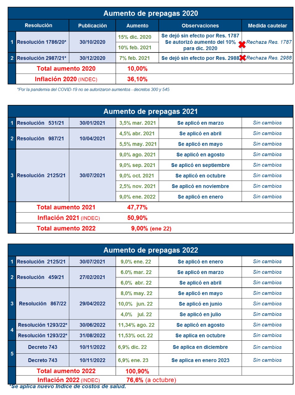 En total, el aumento del 2022 superó el 100%, con un incremento del 100,9%, mientras que la inflación acumulada a octubre llegó al 76,6%. Hasta el momento, las compañías del sector ya retocaron sus valores en enero (9%); marzo (6%); abril (6%); mayo (8%); junio (10%); julio (4%); agosto (11,34%) y octubre (11,53%). Ver artículo Inflación octubre // Ver artículo Se autorizó suba octubre.