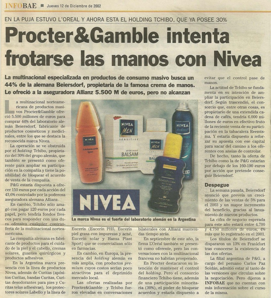 La multinacional norteamericana de productos masivos Procter&Gamble ofreció 5.500 millones de euros para comprar 44% del laboratorio alemán Beiersdorf, fabricante de productos cosméticos y medicinales, entre los que se destaca la reconocida marca Nivea.