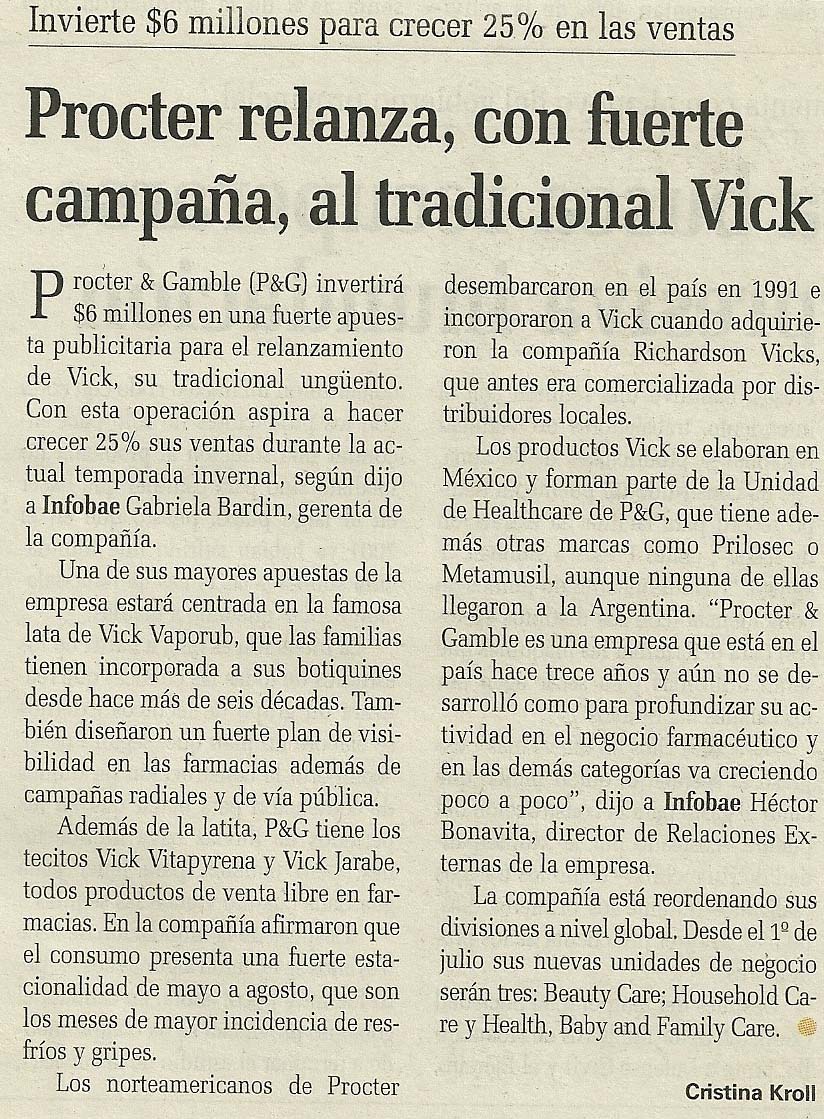 Procter & Gamble (P&G) invertirá $6 millones en una fuerte apuesta publicitaria para el relanzamiento de Vick, su tradicional ungüento. Con esta operación aspira a hacer crecer 25% sus ventas durante la actual temporada invernal, según dijo a Infobae Gabriela Bardin, gerenta de la compañía.