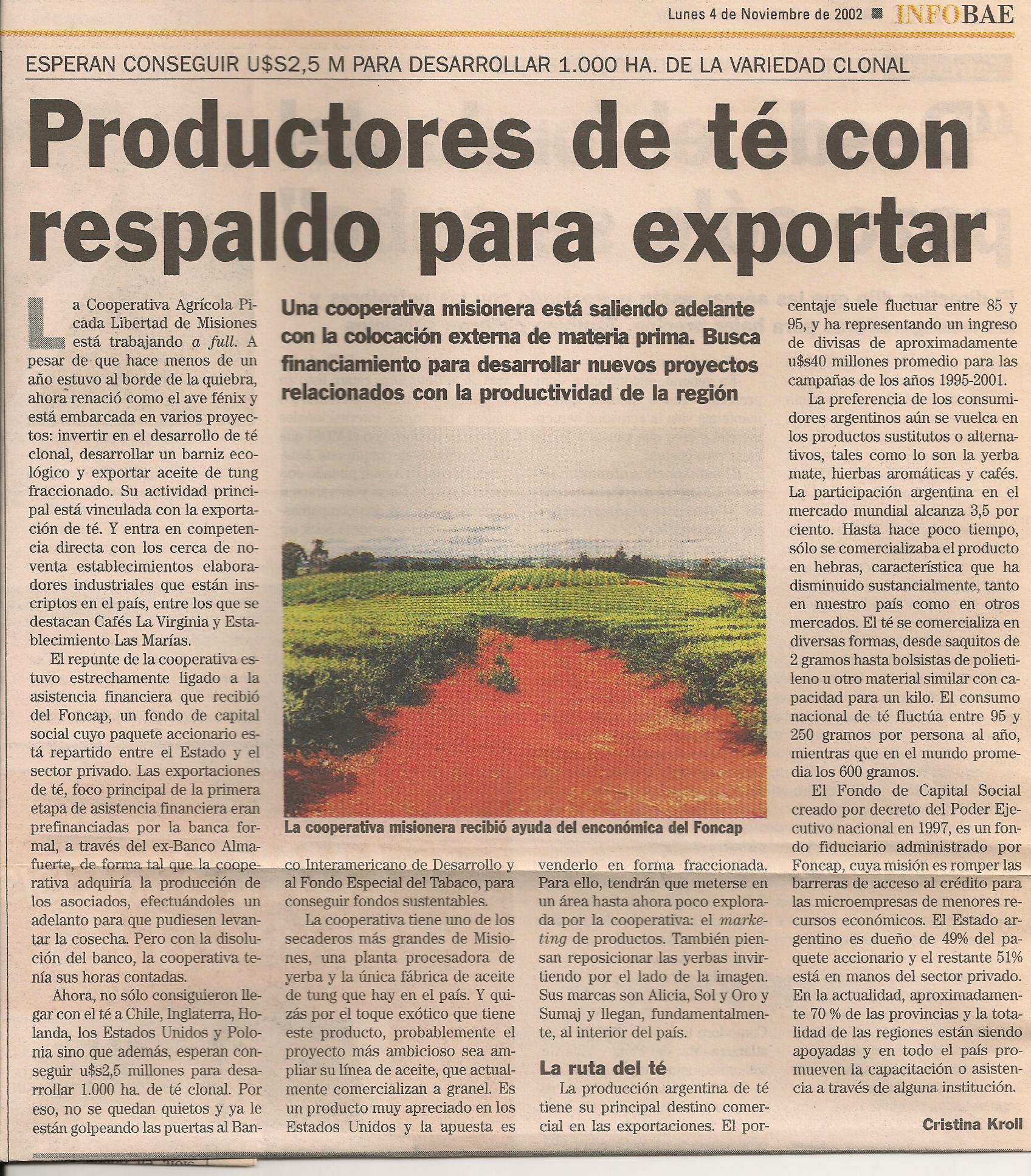 La Cooperativa Agrícola Picada Liberad de Misiones está trabajando a full. A pesar de que hace menos de un año estuvo al borde de la quiebra, ahora renació como el ave fénix y está embarcada en varios proyectos: invertir en el desarrollo de té clonal, desarrollar un barniz ecológico y exportar aceite de tung fraccionado. Su actividad está vinculada con la exportación de té. Y entra en competencia directa con los cerca de noventa establecimientos elaboradores industriales que están inscriptos en el país, entre los que se destacan Cafés La Virginia y Establecimiento Las Marías.