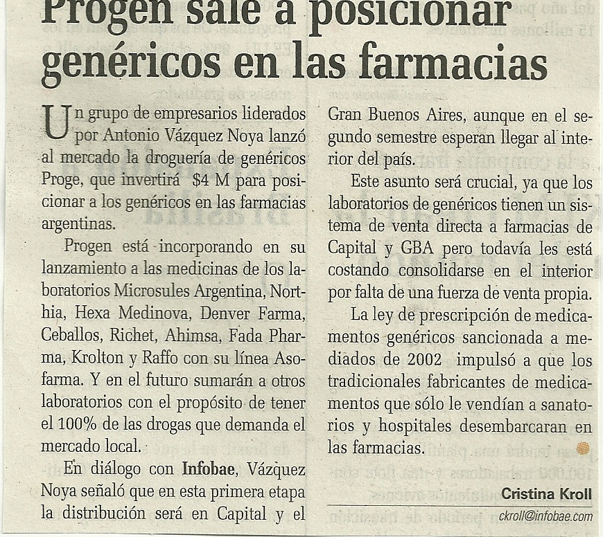 Un grupo de empresarios liderados por Antonio Vázquez Noya lanzó al mercado la droguería de genéricos Proge, que invertirá $4 M para posicionar a los genéricos en las farmacias argentinas.