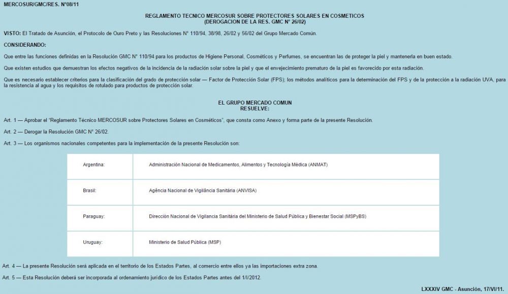 La ANMAT determinó a través de la disposición 957 incorporar al ordenamiento jurídico nacional la Resolución Mercosur GMC Nº 08/11 “Reglamento Técnico MERCOSUR sobre protectores solares en cosméticos. Ver Normativa.
