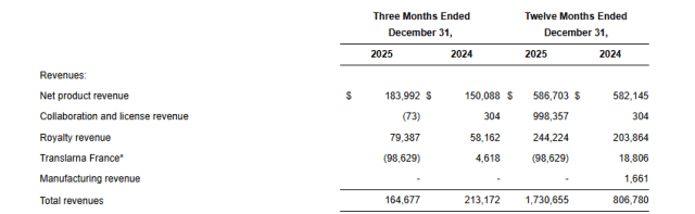 Las ventas de productos se mantuvo casi flat, con un alza del 0,7% a u$s 586 millones, mientras los ingresos generados por colaboraciones fueron los más relevantes, de u$s 998 millones y las regalías fueron de u$s 244 millones. Por su parte, los ingresos netos por productos de Translarna fueron u$s 235,3 millones para todo el año 2025, en comparación con u$s 321,1 millones en el 2024.