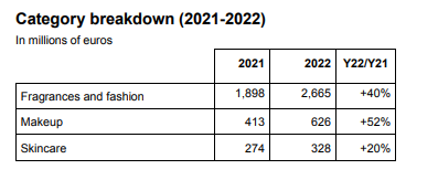 De esta manera el negocio que registró el mayor crecimiento en el año fue el de Maquillaje, de la mano del mencionado portfolio de Charlotte Tilbury. Este segmento exhibió una facturación de € 626 millones, lo que se traduce en un alza del 52% frente al 2021. Luego, la división de Fragancias y Moda se disparó un 40%, con ingresos por € 2.665 millones en este período. Aquí se cita particularmente la performance de las marcas Paco Rabanne y Carolina Herrera. Y, por último, la cartera de Skincare trepó un 20%, con ventas totales de € 328 millones, principalmente gracias a las fórmulas «eco-friendly».