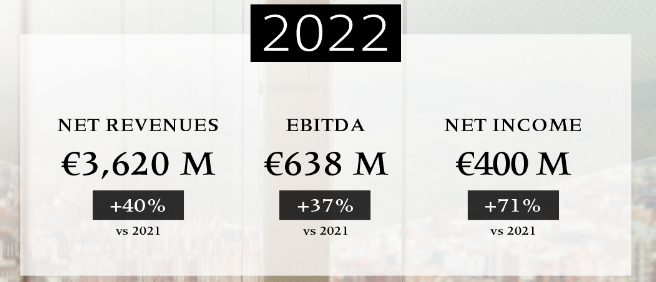 De acuerdo con el documento la multi exhibió ingresos por € 3.620 millones, mientras que en el 2021 las ventas netas habían sido de € 2.585 millones, año en el que concretó la incorporación de la compañía británica de maquillaje y cuidado de piel Charlotte Tilbury. Ver artículo Puig resultados 2021.