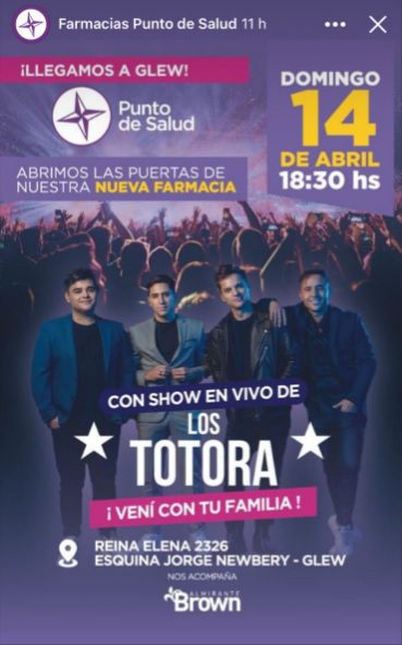 La cadena de farmacias Punto de Salud se expande en el sur del Gran Buenos Aires. El retailer está próximo a inaugurar una nueva boca en Glew, y para eso tiene preparado un show musical a cargo de Los Totora.